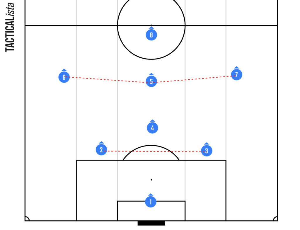 3枚の中盤は横にスライドしながらスペースを消し、ボランチ(アンカー)はその中心でバランスを取ります。
