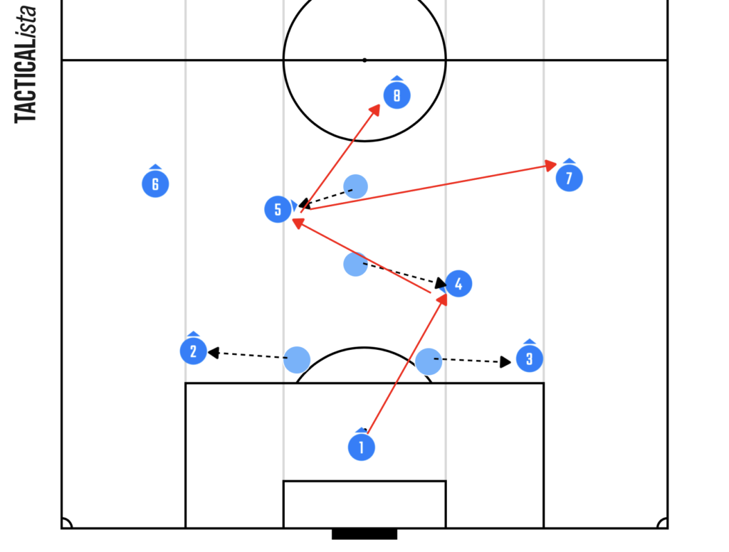 フォワードが相手DFに最初のプレッシャーをかけ、3枚の中盤がその後ろでパスコースを限定します。