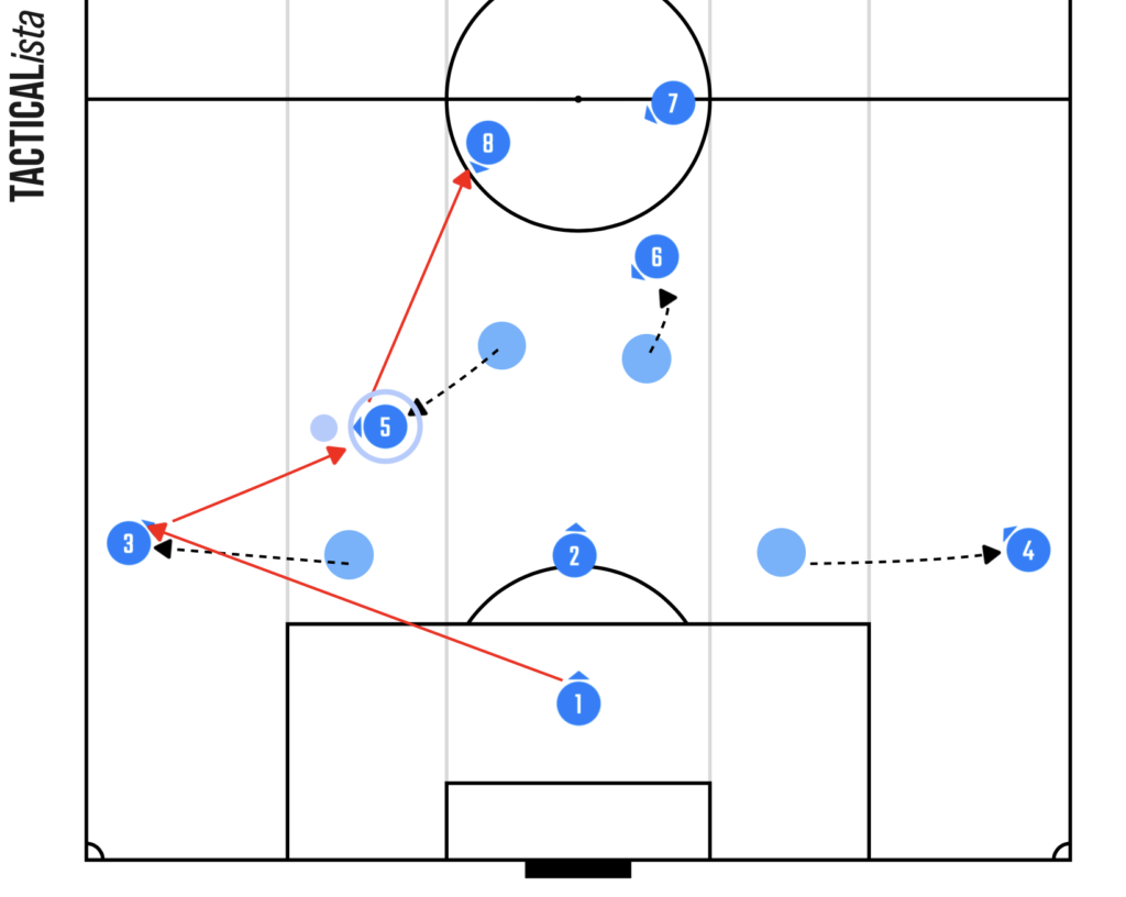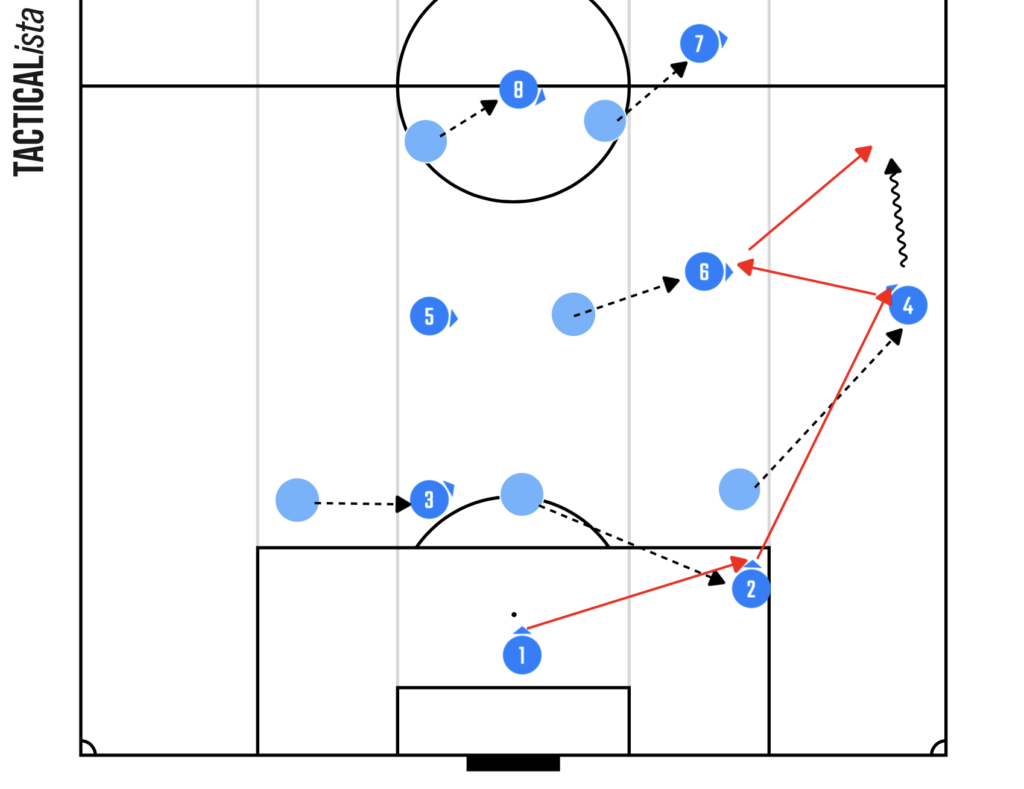 - FW2枚が中央レーンに立ち、ワンツー・縦パスを狙う