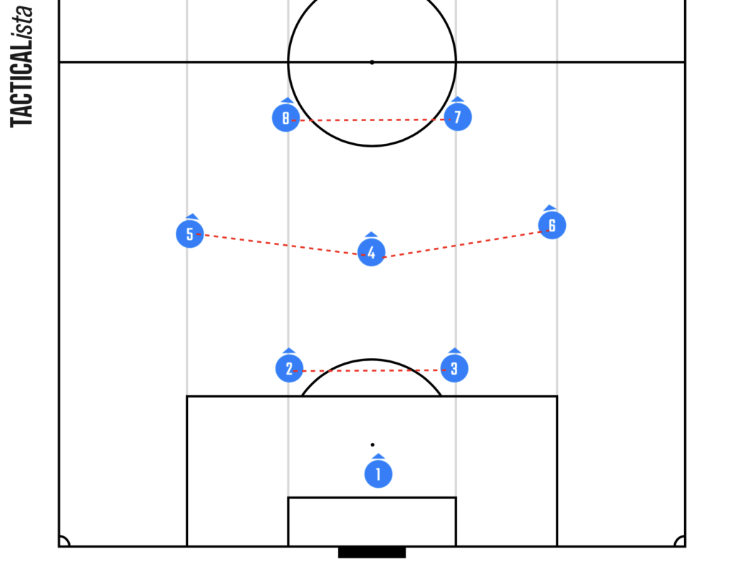 [2-3-2]フォーメーションの守備では、まず中央エリアを最優先で守ることが基本となります。