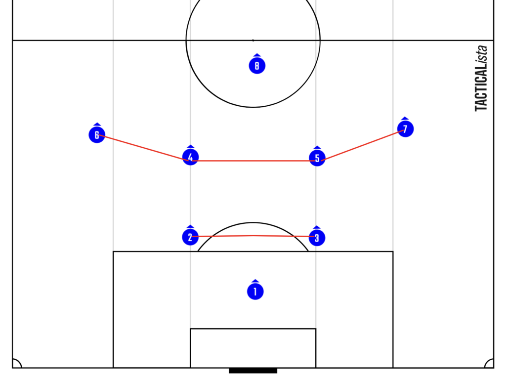 ・中盤4人が横幅を取り、常にパスコースが複数できる距離感で配置します。