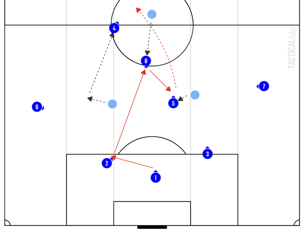 ・その動きに合わせて、中盤の選手が空いたスペースへ前向きに抜け出します。